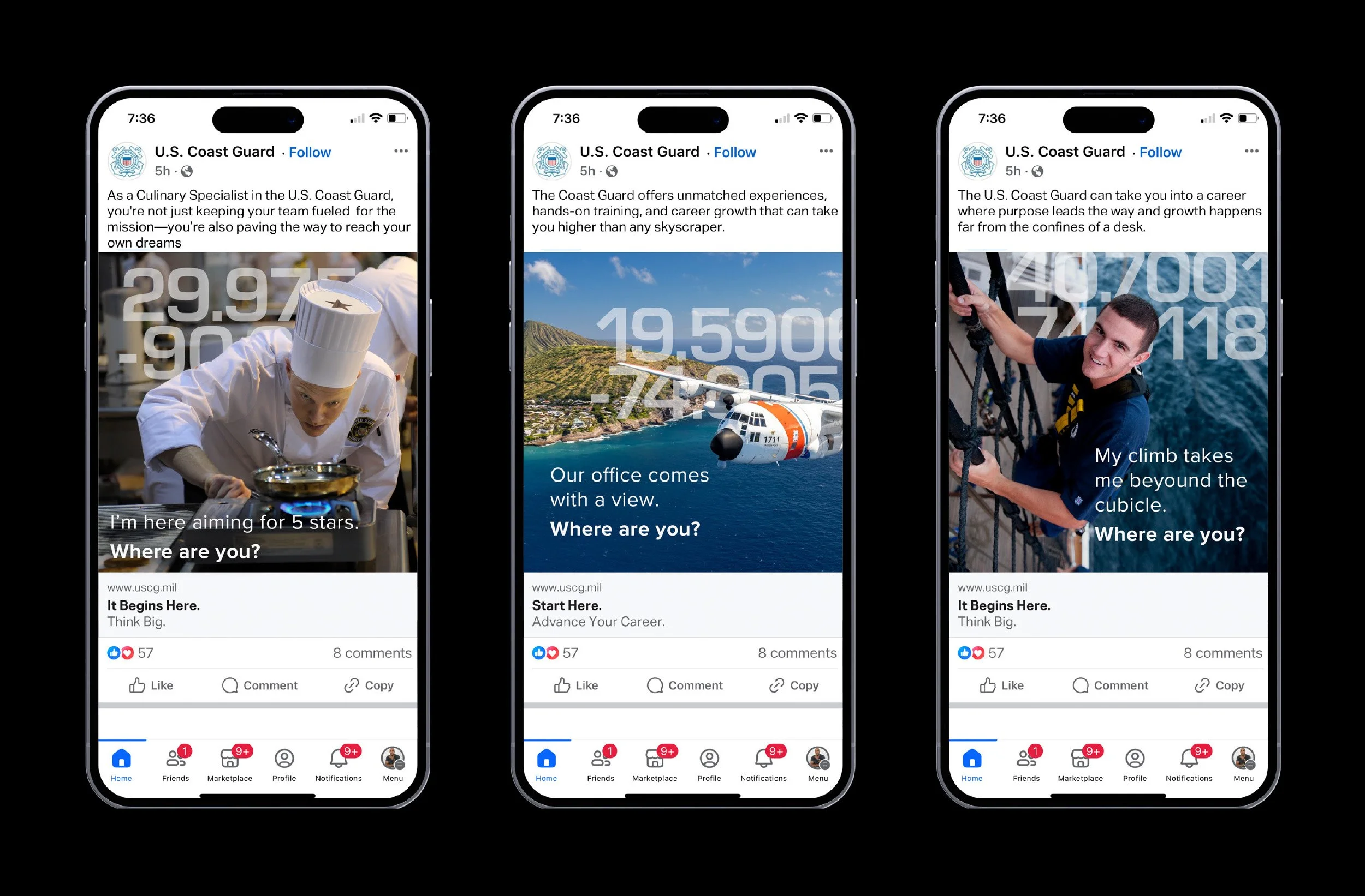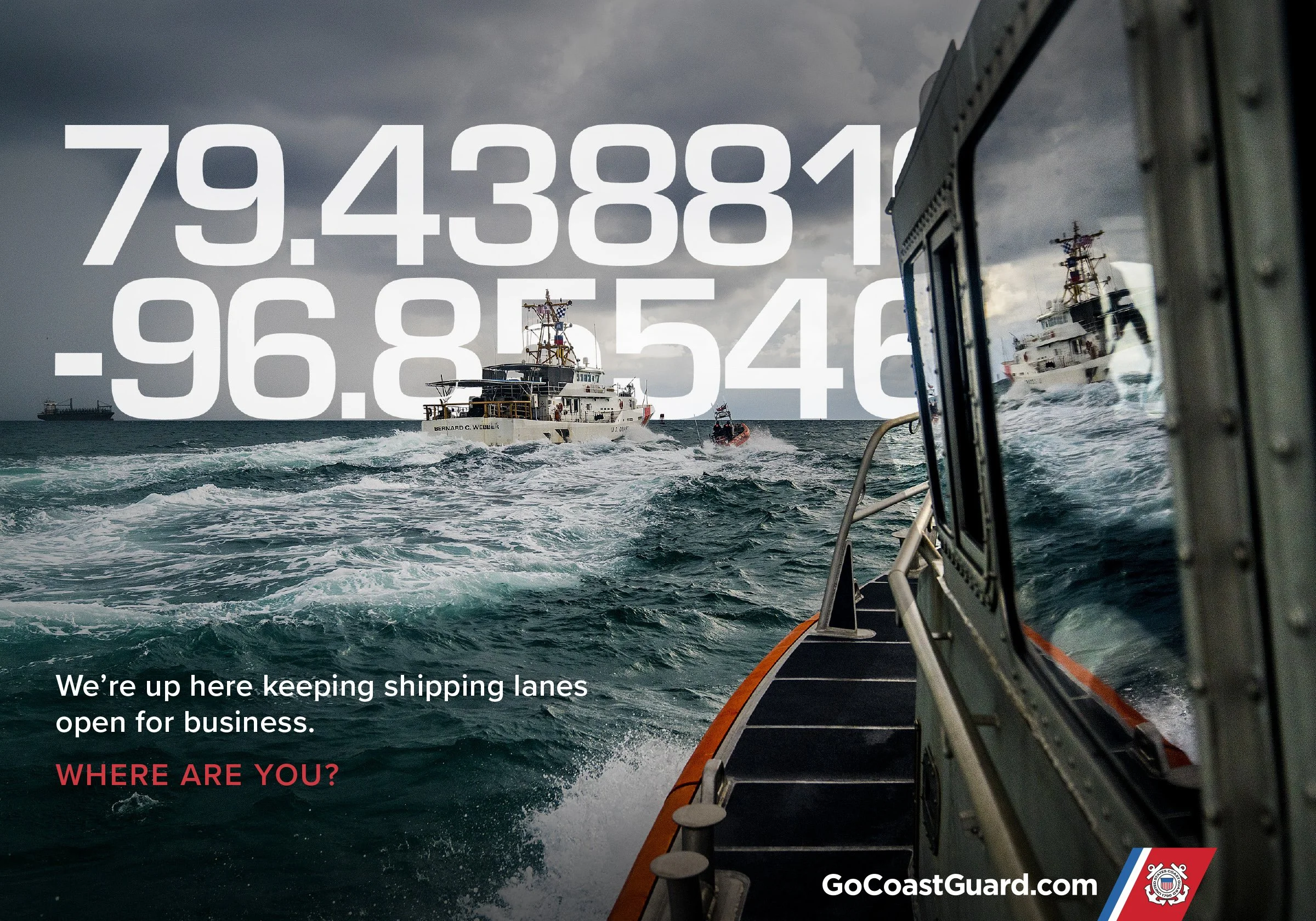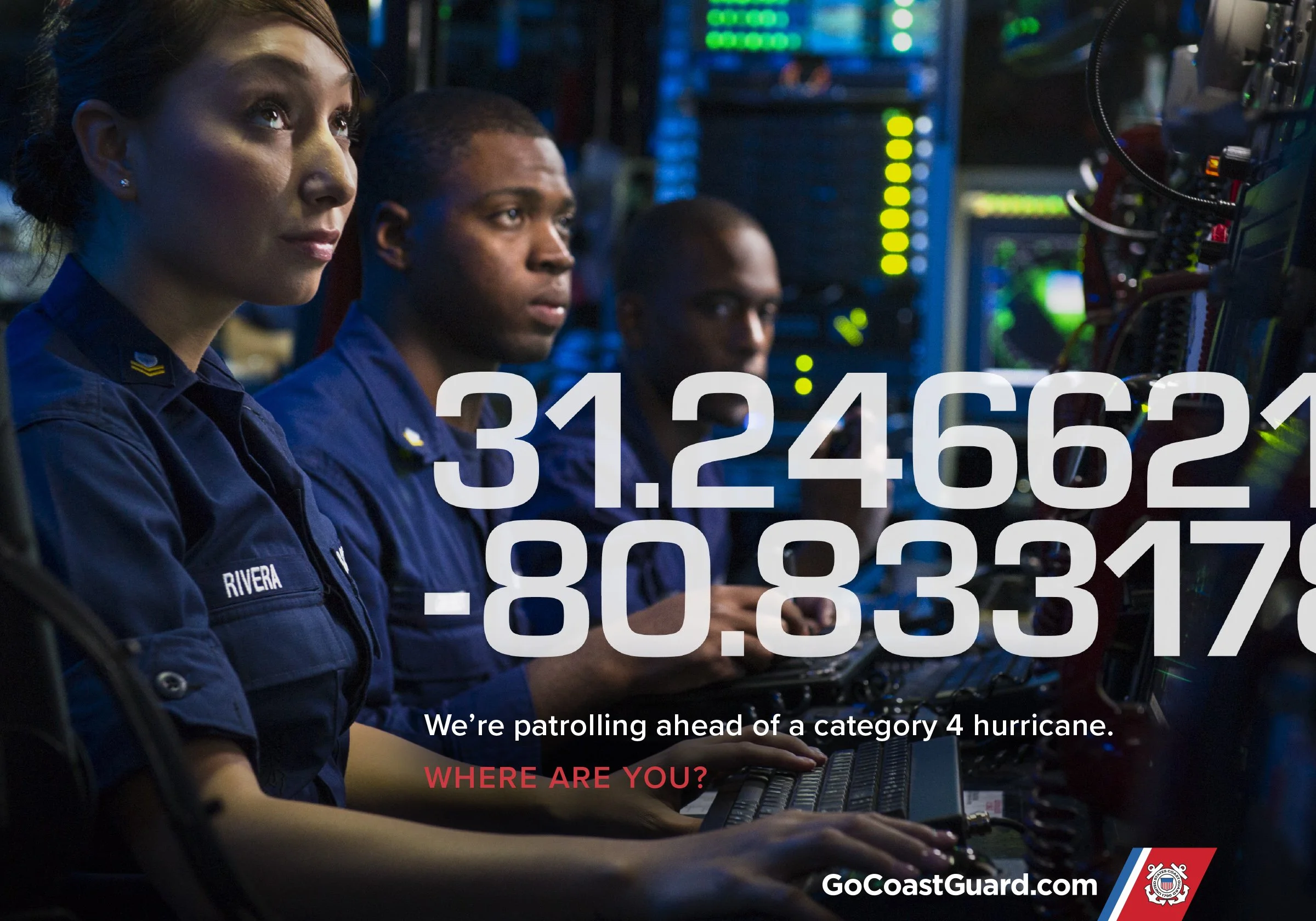 We launched a campaign that embedded location data directly into the visual language—placing the Coast Guard’s mission anywhere in the world, from open ocean to remote disaster zones. But this wasn’t just about latitude and longitude. It was about positioning—challenging recruits to ask: “Where are you right now, and where are you going?”